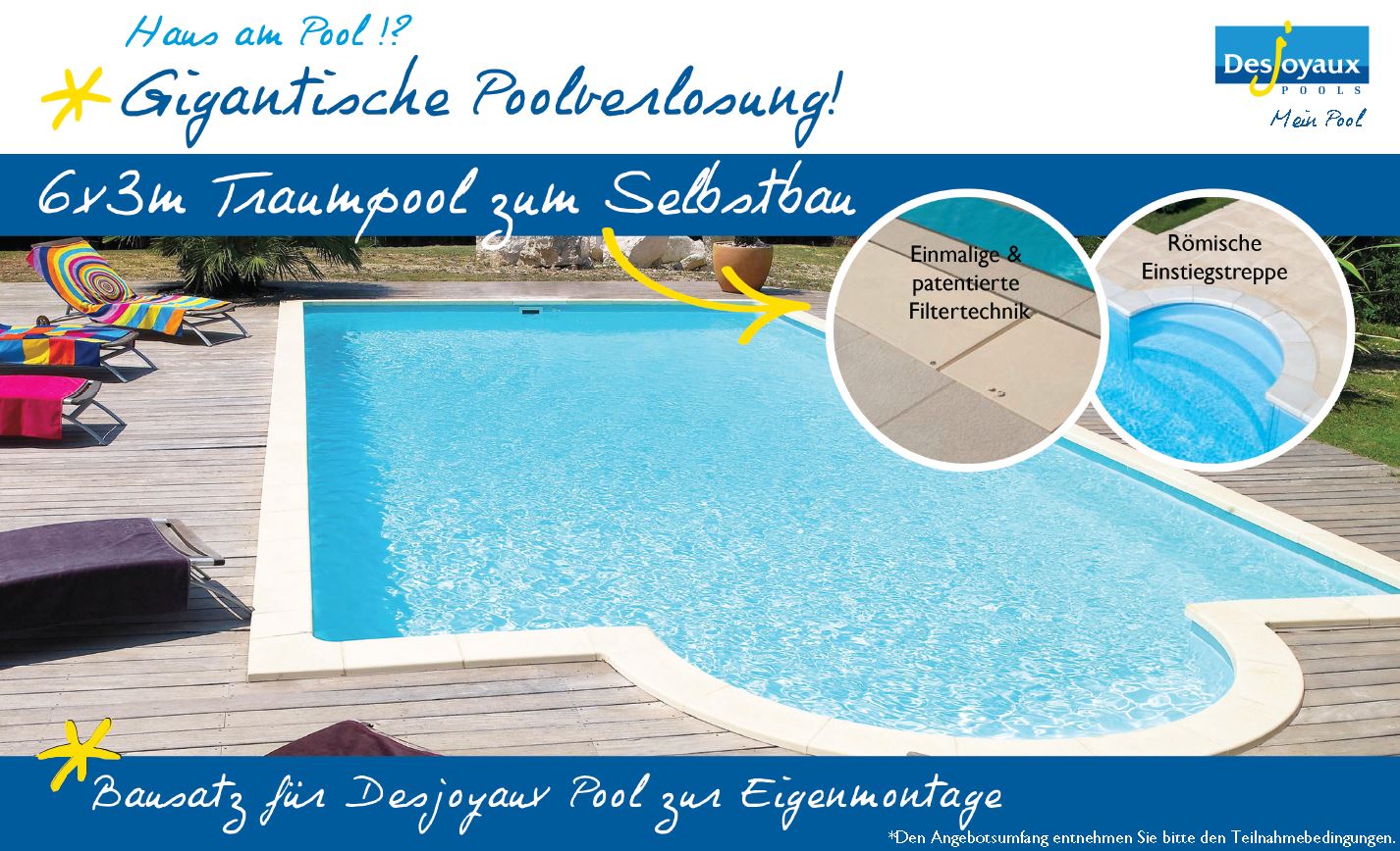 Unsere gigantische Poolverlosung findet im deutschsprachigen Raum (Deutschland, Österreich und Schweiz) vom 28.06.2019 bis einschließlich den 14.07.2019 statt. Sie können ganz einfach teilnehmen, indem Sie auf unserer Facebook-Seite Desjoyaux Pools Deutschland https://www.facebook.com/Desjoyauxpoolsdeutschland/